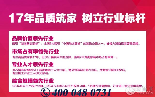 点石家装作为湖南家装领导者,17年来始终坚持以“客户的满意高于一切”为核心宗旨,以“为中国打造千万幸福家”为企业使命,专注于高品质家装。