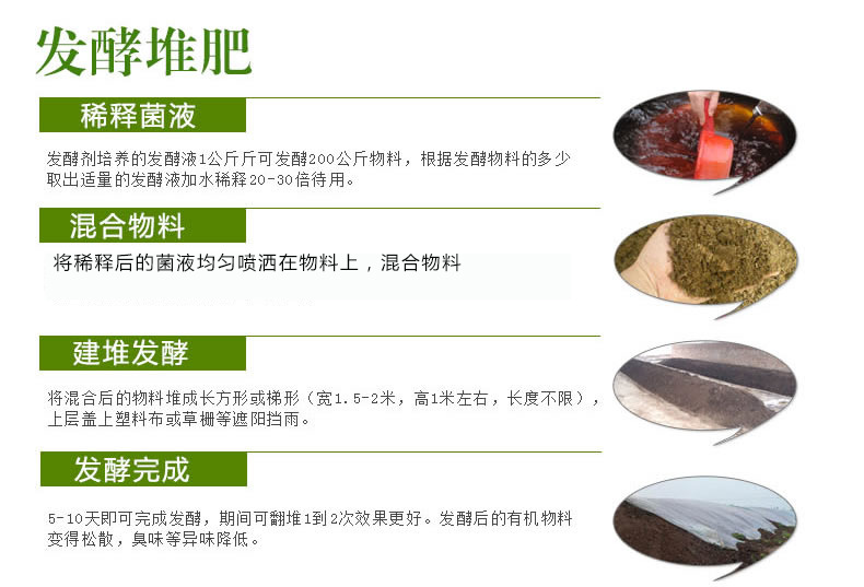 1、制作堆肥:激活后的生物菌肥发酵剂发酵液兑水稀释喷洒在需要发酵的物料上,(如有搅拌机,可直接混合搅拌)每10-20公分厚喷洒一次,喷洒之后翻动均匀,水分控制在60%左右,建堆发酵7-15天即可。