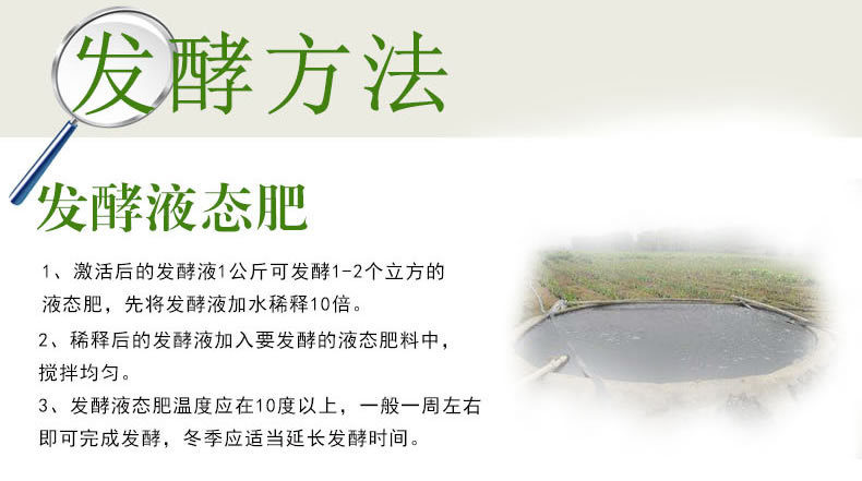 2、制作液态肥:激活后的生物菌肥发酵剂发酵液每公斤兑水10公斤稀释与要发酵的液态肥混合,搅拌均匀发酵7-15天即可。