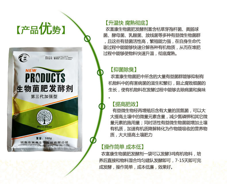 生产生物菌肥离不开生物菌肥发酵剂,而且判断生物菌肥质量的标准之一就是有效活菌含量和活性,农富康生物菌肥发酵剂是从公司成立以来就研发生产和销售的一款高活性微生物制剂产品,富含芽孢杆菌、粪肠球菌、乳酸菌、酵母菌、放线菌、光合菌等多种有益菌群,能快速腐熟发酵动物粪便,秸秆糟渣,各种基质、淤泥等生产制作生物菌肥。