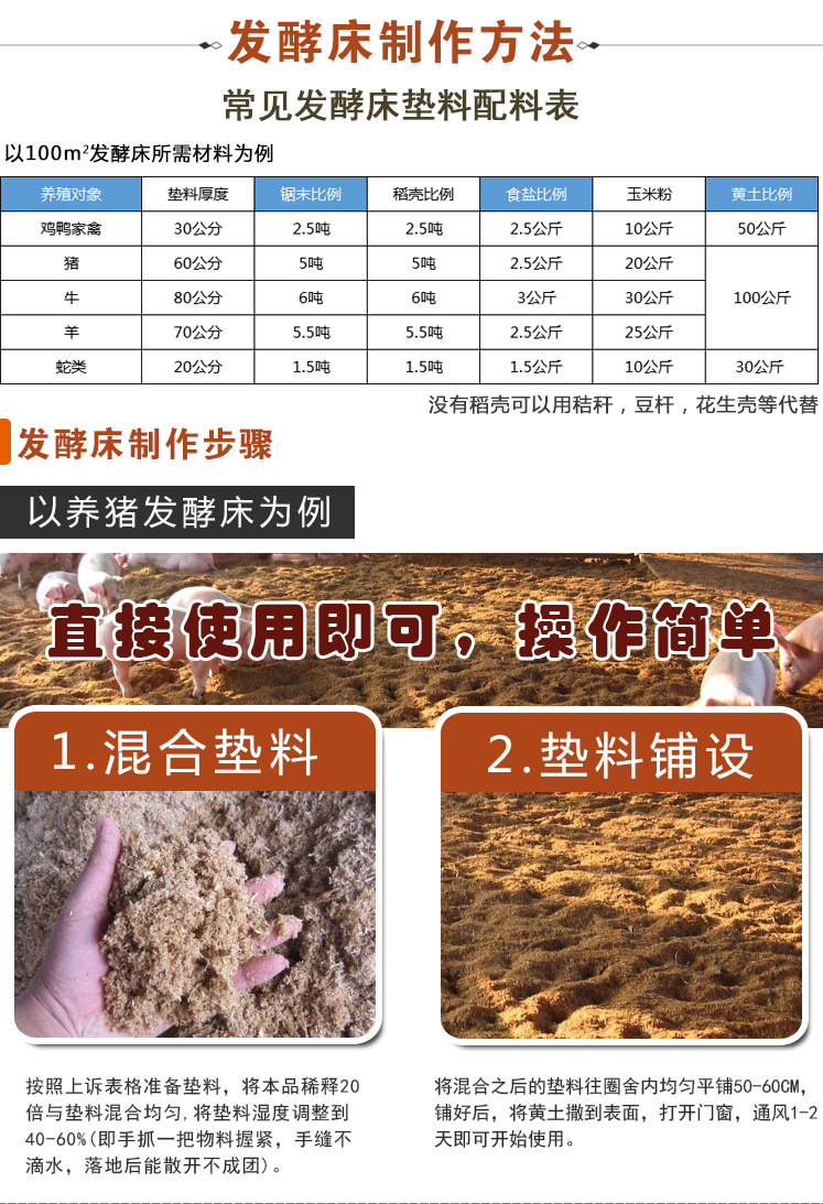 发酵床养猪是通过参与垫料和牲畜粪便协同发酵作用,快速转化成粪、尿等养殖废弃物,消除恶臭,抑制害虫、病菌,同时,有益微生物菌群能将垫料、粪便合成可供牲畜食用的糖类、蛋白质、有机酸、维生素等营养物质,增强牲畜抗病能力,促进牲畜健康生长。 发酵床的制作步骤: 1.将菌液均匀混合到准备的水中,每公斤菌液兑30-50公斤水。