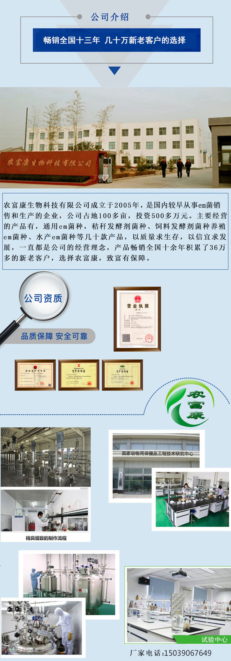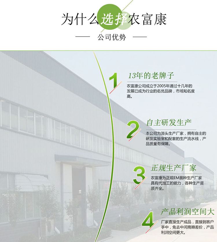 郑州农富康生物科技有限公司成立于2005年,是一家专门从事EM菌种生产、研发、代加工、销售于一体的高新技术产业,拥有完整的生产流水线,和自主研发的实验室,并配有国内先进生产设备,自动灌装、灭菌、检验检测等仪器。同时公司具有庞大的生产优势,与多家大型养殖机构等单位展开技术合作,通过专业研发、科学组方配比、严格的生产工艺要求,生产的EM菌种具有应用范围广,含菌量高,菌种活性强等特点,被广泛应用于水产、养殖、种植、环保等各个领域,产品知名度高,效果好,畅销全国十三年的老牌子,累计服务全国几十万的新老客户! 代工介绍: 公司在注重零售终端运作的同时,同时也发挥专业制造商的生产资源优势,在工厂设立代工部,为客户量身订做EM菌种,可按客户要求提供各类包装类型、各类价位、各类品牌的EM菌种代加工,为客户提供具有强大竞争力产品的同时,也为客户提供具有保障赢利效果的运作方案 公司代工优势: 公司理念: 公司一直以“坚持为客户提供持续高额的利润空间;坚持为员工提供持续增加的劳动报酬和福利待遇;坚持提高员工的幸福指数和快乐指数;坚持关注员工的身体健康和心理健康;坚持为员工的个人发展提供教育机会、工作平台和发展空间。以“个体服从集体、局部服从整体;敬业、学习、向上”为企业精神,以“友善、尊重、诚信、感恩;正直、正派、正言、正行”为企业理念。用完善的经营管理体制、优质的员工福利待遇为前提,标准明确、方向清晰奔向企业发展的新阶段。 厂家咨询电话:15039067649李经理 文章编码:1352770904