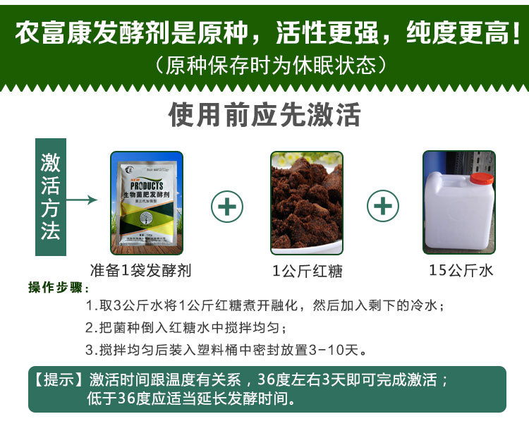 果好,怎样选择效果好的发酵有机肥专用的发酵剂,这些是做有机肥尤为重要的问题, 下面由农富康资深技术员讲解怎样选择效果好的发酵剂怎样操作做出的有机肥效果好: 农富康生物菌肥发酵剂联系电-话:155-6028-2286 赵经理 文章编号:wysl300t 鸡粪里边含有大量的有机质和微量元素。里边的有机质比羊粪和猪粪要高出好几倍, 但是如果时候用的方法不对就会造成烧根烧苗,而使用农富康生物菌肥发酵剂做鸡粪 有机肥不但可以提高肥效而且也可以杀灭里边的杂菌和有害菌,农富康生物菌肥发酵 剂是专门针对发酵有机肥而研制的发酵剂,里边有酵母菌、乳酸菌、枯草芽孢杆菌、 放线菌、光合菌等大量有益菌群。 使用农富康生物菌肥发酵剂的具体好处: 1、降低臭味 改善环境 鸡粪在发酵过程中,氨氮等被分解,避免释放大量的氨氮臭气,造成环境污染 2、提高肥效 避免烧根 农富康生物菌肥发酵剂发酵的鸡粪有机肥肥效高,一次性彻底腐熟,避免了对农作物 造成烧根烧苗 3、彻底腐熟 提高肥效 农富康生物菌肥发酵剂是活菌制剂能够彻底腐熟,让作物更好的吸收鸡粪有机肥里的 营养元素和有机质 4、杀菌灭害 促进生长 鸡粪有机肥在发酵过程中温度可以达到70度,杀死了里边的虫卵和有害菌等。对后期 作物的生长提供了营养,促进作物根部生长 农富康生物菌肥发酵剂发酵鸡粪做有机肥操作方法: 生物菌肥发酵剂是活菌制剂在使用前需要用红糖水激活 1、用量:激活好的15公斤菌液可以发酵3吨有机肥,3吨鸡粪,锯末或者稻壳适量(主 要调节水分,增加碳氮比,也可不添加) 2、混合:菌液加谁稀释与鸡粪混合均匀,发酵物料的水分应控制在50-60%。水分判断 ——手抓一把物料,见水不滴水,落地即散为宜。水少发酵慢,水多通气差; 3、倒堆:由于鸡粪堆表面和堆内温度不同,发酵腐熟程度不同,应适时倒堆,一般发 酵时间10-15天,倒堆次数一般2次。 农富康生物菌肥发酵剂联系电-话:155-6028-2286 赵经理 文章编号:wysl300t 农富康生物科技有限公司从事益生菌发酵剂研发生产已达13年之久,具有丰富的经验 及娴熟的技术,所生产的一系列商品 受到了广大用户的喜爱和好评,大工厂。老品 牌值得你的信任与选择,购买农富康产品送你长期的技术指导和讲解详细的资料书有些人说自己发酵的鸡粪有机肥没有卖的效果好,怎样处理鸡粪做有机肥臭味小,效
