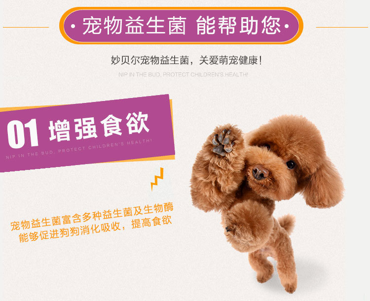 妙贝尔宠物益生菌专为宠物研发,其中包含丰富的、适用于狗狗的益生菌。产品上市10多年来,深受众多“铲屎官”们的信赖,更是得到了众多专业宠物医院的青睐!