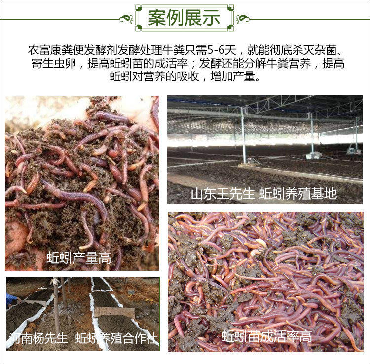 用农富康粪便发酵剂发酵牛粪养蚯蚓,可增重25~30%以上,越是饲喂到后期,增重越快,可提前7~10天上市。