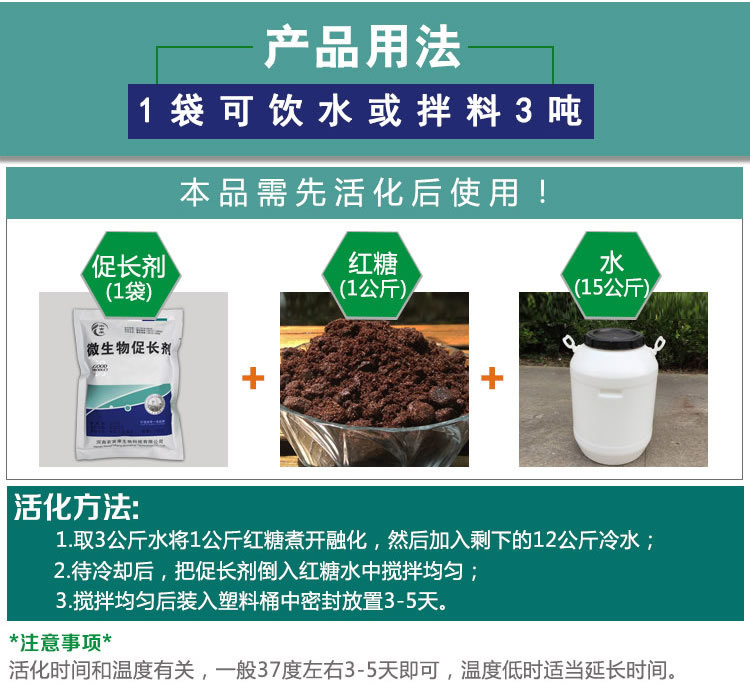 由于微生物促长剂没有任何副作用,所以可以从鸡鸭鹅出壳就给鸡鸭鹅用,1袋微生物促长剂用1公斤红糖加15公斤清水激活成菌液,1公斤菌液按照1:200的比例给鸡鸭鹅日常饮水拌料使用,使用简单方便,不影响正常的防疫,用药。