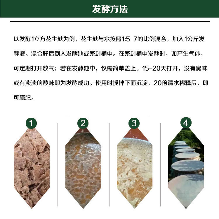 注:若发酵时花生麸与水比例较大(如1:15或者1:100等),施用时可不再稀释或者勾兑倍数较小使用。