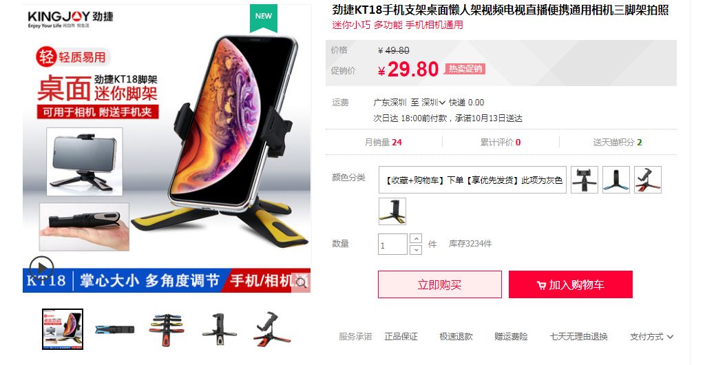 之前有在劲捷买过相机的三脚架,这次看到劲捷新出了一款手机桌面迷你支架,看上去蛮不错的,很小巧,还可以支撑单方相机。关键是价格贼便宜,领劵还可以再便宜10元,所以抱着宁可买错不可错的的心态,果断入手了这筐劲捷KT-18!
